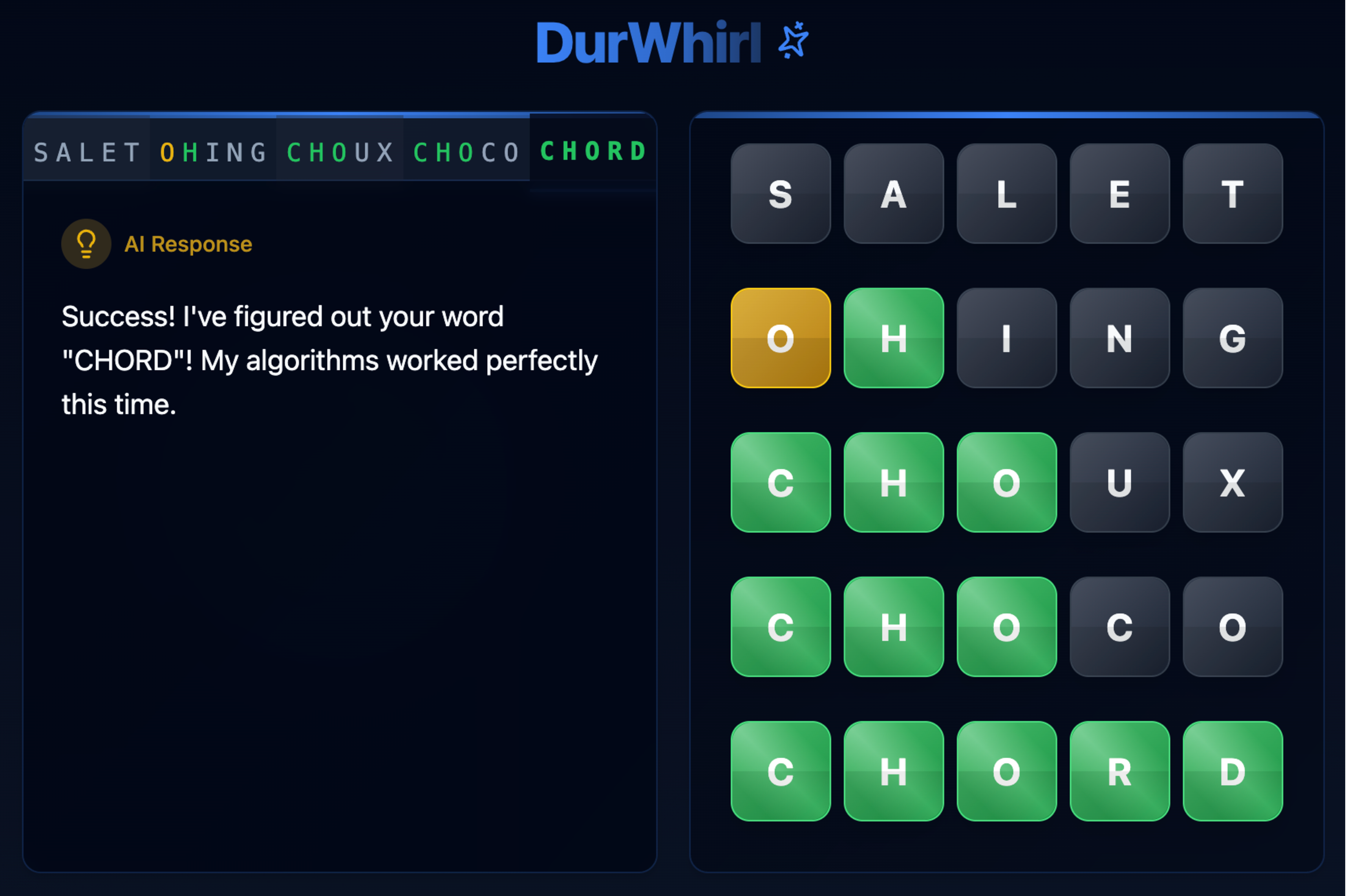 DurWhirl flips the classic Wordle loop: you type a word and watch a luminous interface visualize the AI's guesses. The game leans on buttery gradients, playful animations, and a lightweight runtime that works across mobile and desktop.